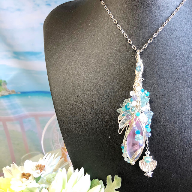 アクアオーラ、アクアマリン、アマゾナイトシリカ、ネオンブルーアパタイトと、様々な青い石を盛り込みつつ。